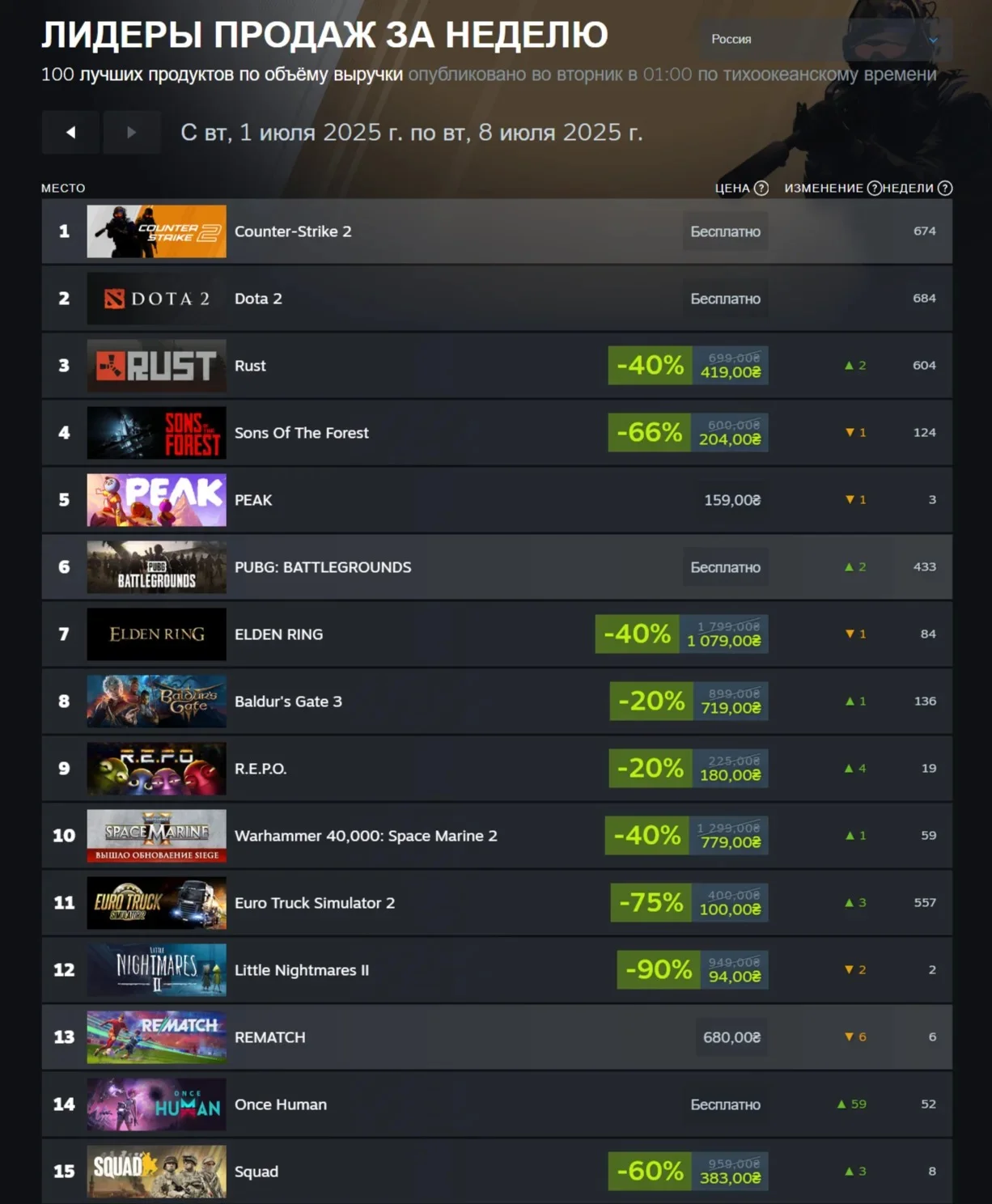 Из-за летней распродажи в топ также вернулись Cyberpunk 2077, Red Dead Redemption 2, Baldur’s Gate III и Clair Obscur: Expedition 33. В чарте условно-бесплатынх игр всё без изменений — Counter-Strike 2, Apex Legends и Playerunknown’s Battlegrounds всё ещё никуда не делись:
